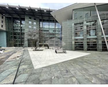 Neben der Rezeption und der Empfangslounge beheimatet der zentrale Eingangspavillon in Zukunft auf den verschiedenen Ebenen alle Bereiche, die den Arbeitstag komfortabel ergänzen: einen Event Space, Gastronomie und Barista-Flächen, einen hauseigenen Kindergarten sowie eine Paketstation. Im hinteren Teil des Erdgeschosses öffnet sich der Pavillon zu einem großzügigen Innenhof, der mit Pflanzen und Wasserflächen zum grünen Erhol-Moment oder zum Raum für Outdoor-Meetings wird.