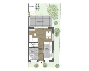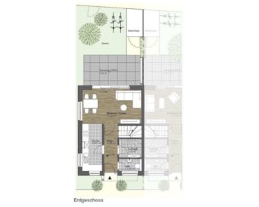 Der großzügige Wohn- und Essbereich bildet das Herzstück des Hauses und lädt mit viel Tageslicht zu gemütlichen Stunden ein. Die offene Küche fügt sich harmonisch in den Raum ein. Von hier aus gelangen Sie direkt auf die Terrasse und in den Garten – eine großzügige, pflegeleichte Grünfläche, die sich ideal für entspannte Stunden im Freien eignet. Ein praktisches Gäste-WC rundet das Erdgeschoss ab.