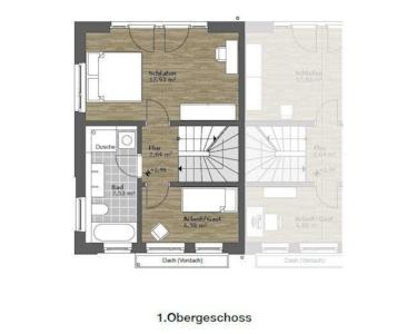 Das Obergeschoss bietet Ihnen einen privaten Rückzugsort, in dem Ruhe und Komfort im Mittelpunkt stehen. Mit seiner cleveren Raumaufteilung verbindet das Badezimmer funktionale Elemente wie Dusche, Badewanne und Waschmaschine zu einer harmonischen Einheit – praktisch und modern zugleich. Ein zusätzliches Zimmer schafft Raum für ein Homeoffice oder kreative Hobbys – flexibel nutzbar, ganz nach Ihren individuellen Bedürfnissen.