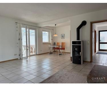 Etwas nach hinten versetzt befindet sich der Hauseingang, der geradeaus über einen kleinen Flur in die helle und offen gestaltete Hauptwohnung im EG führt. Diese ist mit einer funktionellen Tageslicht-Küche, einem lichtdurchfluteten Wohn- und Essbereich mit Schwedenofen, einem Badezimmer mit Waschbecken, WC, Dusche und Badewanne sowie mit einem weiteren Kinder- oder Gästezimmer ausgestattet.