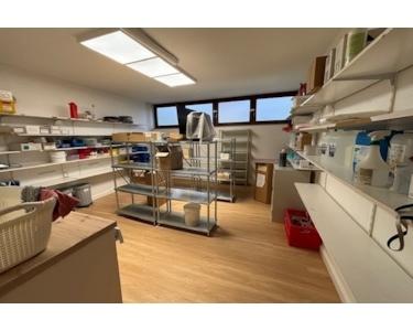 Das Untergeschoss umfasst einen geräumigen Pausenraum mit integrierter Küchenzeile, eine Lagerfläche von ca. 22,77 m², einen Technik-/Kompressorraum sowie eine Garderobe. Zudem befinden sich hier WC-Räume und eine Dusche. Die Räume sind mit strapazierfähigen Bodenbelägen aus Fliesen und Laminat ausgestattet. Eine Zentralheizung ist ebenfalls vorhanden.