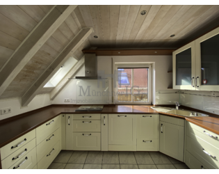 Über das freundliche Treppenhaus erreichen Sie Ihr neues Domizil. Vom Eingangsbereich aus gelangen Sie in den großzügigen Wohn- und Essbereich, der mit bodentiefen Fenstern im Erker sowie einem großen Dachfenster lichtdurchflutet zum Verweilen einlädt. Besonders eindrucksvoll ist die sichtbare Massivholzdecke, denn sie unterstreicht die unterschiedlichen Raumhöhen und vermittelt ein Chalet-Feeling. Darüber hinaus sorgt in den kühlen Monaten der Kamin für Wohlfühlambiente. Zum attraktiven Wohnbereich gehört die separat gelegene Küche. Sie ist mit einer Einbauküche im modernen Landhausstil mit kassettierten Schranktüren und historischen anmutenden Türgriffen ausgestattet. Ein Ceran-Kochfeld, die Dunstabzugshaube, ein Garofen auf Arbeitshöhe, Halogenspots und weiteren Marken-Geräte gehören zur wertigen Ausstattung.