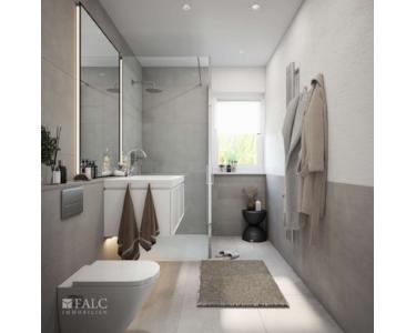 • Bäder mit großformatigen Fliesen (80 × 80 cm, matt, grau) an Boden und Wänden (inkl. deckenhoher Duschbereich)