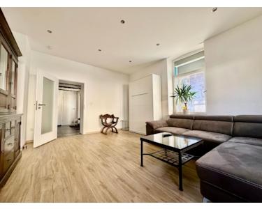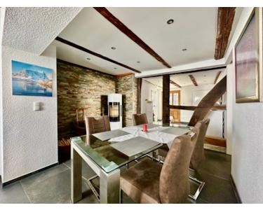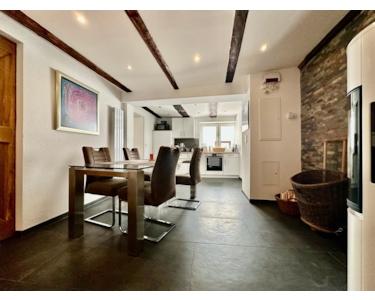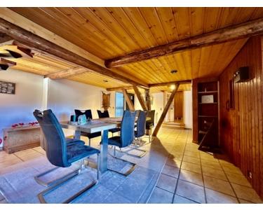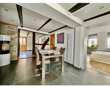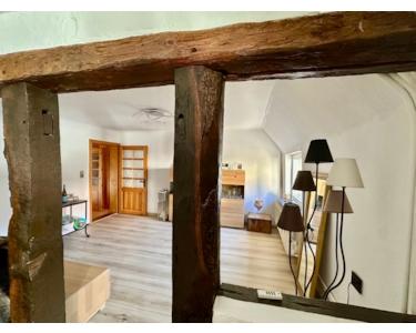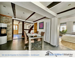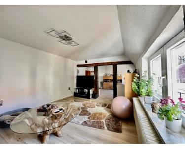 Das gemütliche Wohnzimmer befindet sich zwischen dem Esszimmer und der Küche und hat auch nach der umfassenden Renovierung, Dank der freigelegten Fachwerk-Struktur, den Altbau-Charme erhalten können.