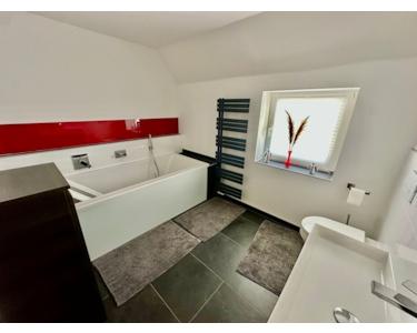 Vom Essbereich aus gelangen Sie in das zweite Tageslichtbad. Hier lädt eine große Badewanne, umgeben von einer indirekten Beleuchtung, zu erholsamen Aufenthalten ein.