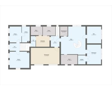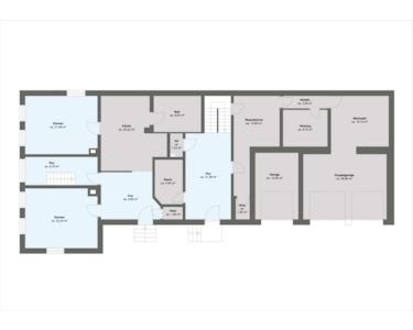 Vom Treppenaufgang führt der Weg links in das große Esszimmer mit angrenzender Speisekammer und Sauna, sowie dem Gäste- und Arbeitszimmer.