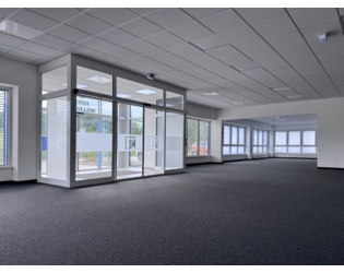 Die komplette Front der Ausstellungsfläche ist mit großflächigen Fenstern mit elektrischen Rollos versehen. Im Boden sind bereits EDV-Verkabelungen für einen Empfangstresen vorhanden.