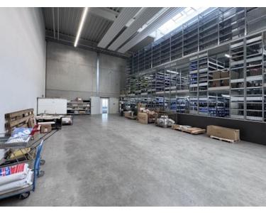 Das beheizbare Lager hat eine Höhe von ca. 9 m und verfügt über zwei ebenerdige LKW-Rolltore, eines davon in einer Schleuse für Nachtanlieferungen. Das Rolltor 1 hat eine Breite von ca. 3,65 m und eine Höhe von ca. 2,95 m, das Rolltor 2 hat eine Breite von ca. 2,45 m und eine Höhe von ca. 2,45 m. Der Boden im Lager ist belastbarer Industrieestrich mit Kunstharz-Beschichtung. Das ehemalige Gefahrgutlager wurde vom Lager abgetrennt. Es wurde in ein Büro mit Laminatboden und einer Deckenhöhe von ca. 2,50 m sowie einem Sozialraum mit Küchenanschlüssen umgebaut. Ein Rückbau ist jederzeit möglich.