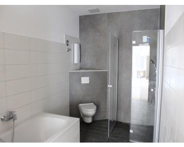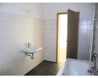 Mehrfamilienhaus, 3 Zimmer, 1. Obergeschoss, Flur, Kinderzimmer, Wohnzimmer mit offener Küche, und Gaskamin, Bad mit Wanne, Dusche, WC, Handwaschbecken, Handtuchheizkörper