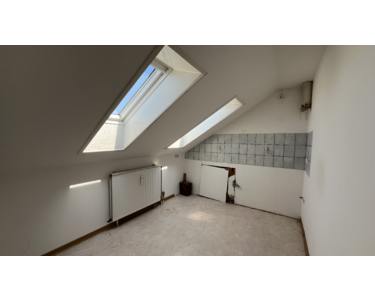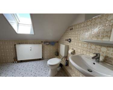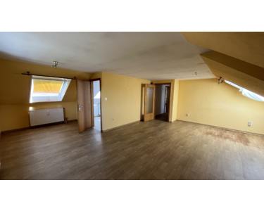 Die Dachgeschosswohnung umfasst eine Wohnfläche von ca. 60 m² und beherbergt ein großes Schlafzimmer, ein Badezimmer mit Dusche, einen Kochbereich, ein großes Wohn-/Esszimmer und ein Büro/Gästezimmer. Die Dachgeschosswohnung ist ebenfalls renovierungsbedürftig. Nach einer groben Renovierung wäre eine potentielle Miete bei ca. 550,-€ Kaltmiete/Monat.