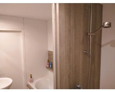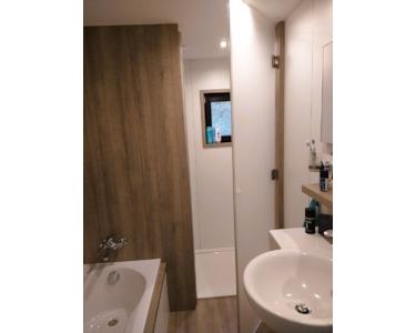 Schönes, geräumiges, modernes Badezimmer mit Badewanne und ebenerdiger Dusche. Komplett mit Waschbecken und großem Spiegel mit integrierter Beleuchtung.