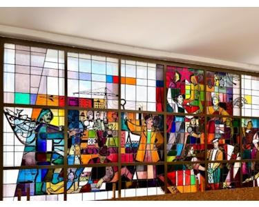Ein besonderer Blickfang ist das außergewöhnliche Bleiglasfenster. Große Fensterfronten sorgen für freundliche und lichtdurchflutete Räume.