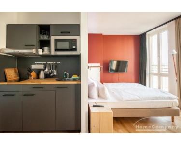 • Jedes Design-Apartment verfügt über eine voll ausgestattete Küchenzeile und Eichenholzböden.