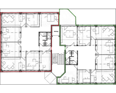Die ruhig gelegene Büroeinheit im zweiten Obergeschoss mit Dachterrasse erfüllt alle Voraussetzungen einer kompakten und hochwertigen Büroeinheit. Zu vermieten sind 190m², die im Grundriss grün markiert sind. Weitere 190m² können bei Bedarf hinzugemietet werden, eventuell auch zu einem späteren Zeitpunkt. Ein weiteres Highlight ist die objekteigene Dachterrasse, die der zukünftige Mieter jederzeit mitnutzen kann (zzgl. 20m² Dachterrassenmiete (12,90€/m²) zur gemeinschaftlichen Nutzung). Die gewünschte Vertragslaufzeit beträgt 4 Jahre. Die Büroeinheit ist ideal für Start-ups und Firmen mit akutem Expansionsbedarf geeignet.
