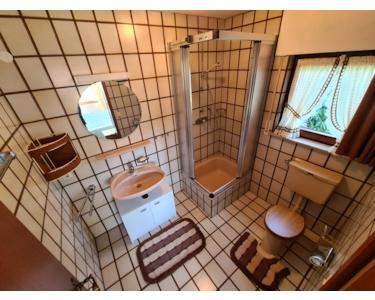 # Tageslicht-Badezimmer mit Dusche, Waschbecken, WC und Fußbodenheizung im UG