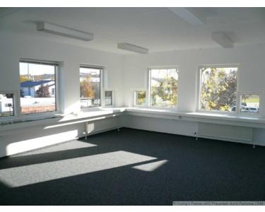 Große helle Fenster, abgehängte Decken mit Einbauleuchten, robuste aber dennoch elegant wirkende Auslegware schaffen ein angenehmes Arbeitsklima.