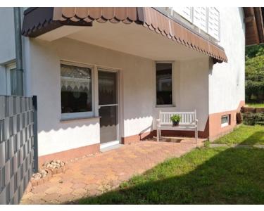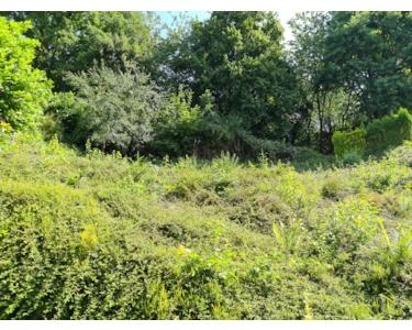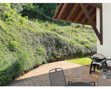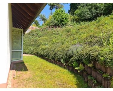 Das Grundstück ist anschließend an Haus und Terrasse als ebene Rasenfläche angelegt; zum angrenzenden öffentlichen Waldgelände hin verläuft das Grundstück stark ansteigend und ist mit Bodendeckern bepflanzt.