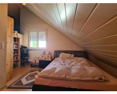 - Dachschrägen sind mit Spanplatten und weißen Holzpaneelen verkleidet.