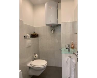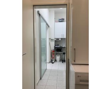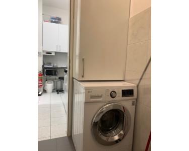 Die Nutzfläche verteilt sich auf den Lagerraum sowie den Küchenbereich und eine Toilette mit einem kleinen Vorraum. Der Platz für eine Waschmaschine und ein Trockner sind ebenfalls vorhanden.