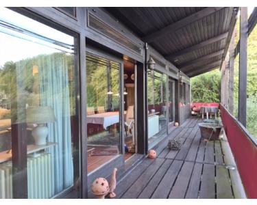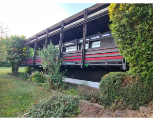 Das im Jahr 1972/1973 als Architektenhaus in Massivbauweise errichtete Anwesen ist ein eingeschossiger Bungalow mit Satteldach und großen bodentiefen Fensterelementen zur Südseite, die alle auf einen ca. 28 m² großen überdachten Südbalkon hinausführen.