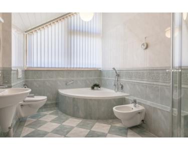 Modernes und komplett gefliestes Bad mit Dusche, Eckwanne, Bidet und WC