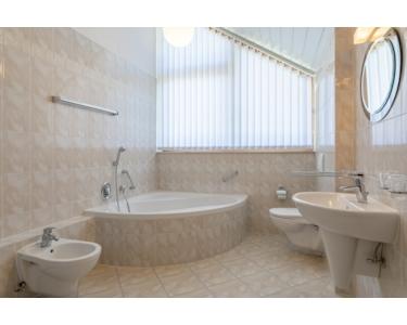 Modernes und komplett gefliestes Bad mit Dusche, Eckwanne, WC und Bidet