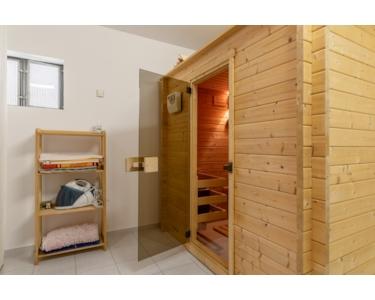 Ein großer, gefliester Keller beherbergt nicht nur praktische Räume, sondern auch einen Saunabereich – Ihre private Wellnessoase!