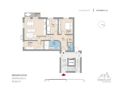 Diese großzügige 4-Zimmer-Wohnung im Erdgeschoss erstreckt sich über 95,05 m² und bietet einen offenen Wohn-/Essbereich mit integrierter Küche, ein Schlafzimmer, ein Arbeitszimmer und ein Gästezimmer. Das moderne Bad ist mit einer Dusche ausgestattet; zusätzlich gibt es ein separates WC. Der lichtdurchflutete Wohn-/Ess-/Kochbereich öffnet sich zur sonnigen Süd-/Westterrasse mit angrenzendem Gartenanteil mit Sondernutzungsrecht, der sich großzügig um die Wohnung herum erstreckt ein echtes Highlight dieser Wohnung.