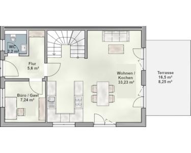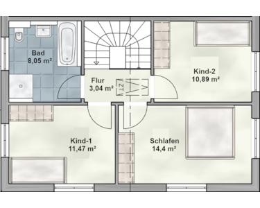 Die Doppelhaushälfte verfügt über insgesamt 2 Etagen (EG + OG) und einen Keller. Es wird mit einem Satteldach erbaut. Im Erdgeschoß befinden sich der große Wohn- Essbereich, ein Büro/Gästezimmer, die Küche, der Flur und ein WC. Im Obergeschoß sind 3 Schlafzimmer und ein großes Bad. Im Keller befinden sich 2 Kellerräume und ein Hauswirtschaftsraum. Die genaue Aufteilung ist noch genau bestimm- und variierbar. Das Haus ist hochwertig ausgestattet und mit allen wichtigen Details ausgestattet. Zu diesen gehören z.B.: