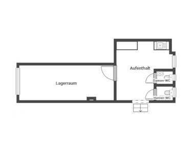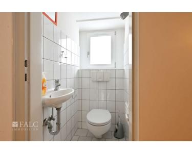 Über eine Treppe gelangen Sie vom Empfangsbereich aus in das Untergeschoss. Hier befinden sich eine Küche, ein Lagerraum sowie getrennte WC-Anlagen für Damen und Herren – gut durchdacht für den täglichen Büroalltag.