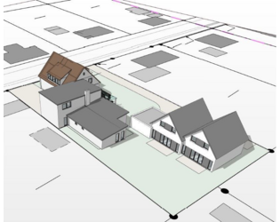 Es handelt sich um ein Hintergrundstück mit ca. 900 m². Es ist eine Bebauung mit einem Doppelhaus zulässig. Die nachstehende Darstellung bildet den Bestand des vorderen Grundstückes sowie das Baugrundstück nebst geplanten Neubau ab.