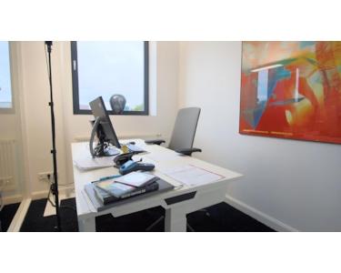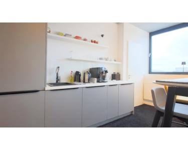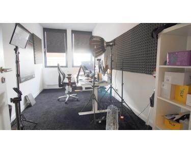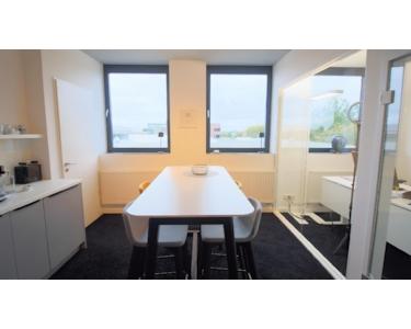 Ein besonderes Highlight der Einheit sind die Glaswände, die den Räumen eine moderne und offene Wirkung verleihen. Diese Konstruktion sorgt nicht nur für einen exzellenten Lichteinfall, sondern fördert auch eine transparente und kommunikative Arbeitsatmosphäre. Ergänzt wird dies durch die großen Fensterfronten, die jeden Raum in Tageslicht tauchen und eine angenehme Umgebung schaffen.