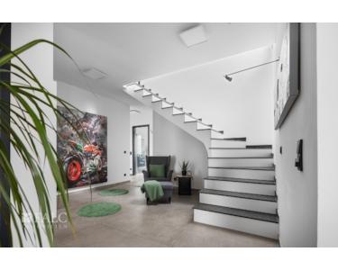 Im Erdgeschoss sind große Fliesen verlegt. Im Obergeschoss befindet sich ein Designboden in Holzoptik.