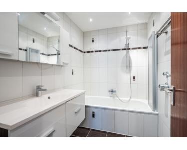 Die separate Küche verfügt über ausreichend Stauraum und Platz für eine kleine Sitzgelegenheit. Das Badezimmer ist mit einer Badewanne ausgestattet, zusätzlich steht ein praktisches Gäste-WC zur Verfügung.