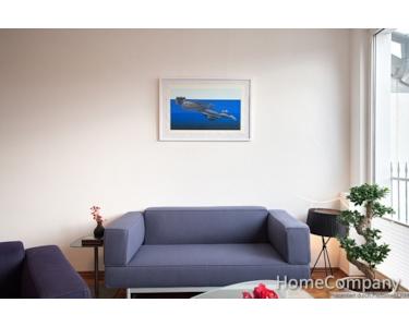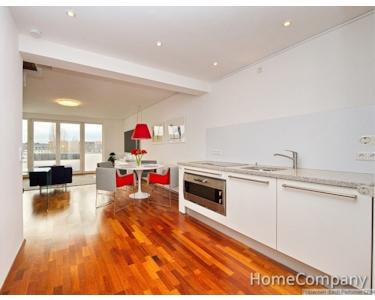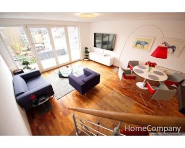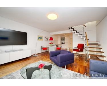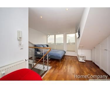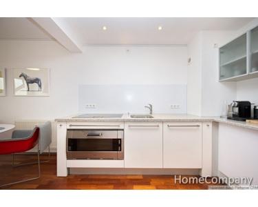 A dream home, right in the heart of the city! The lift conveniently and safely takes you to your apartment on the fifth floor. The lift only travels to the fifth floor when inserting your key. Across two levels, the apartment offers everything you need to make your stay in Düsseldorf unforgettable. Upon arrival on the fifth floor, you enter the generously proportioned living area, featuring a French balcony. Furnished with the finest designer furniture, it offers a cosy seating area featuring a sofa and an armchair. A smart TV, Teufel sound bar and high-speed internet access are also provided. The dining table offers space for four people. The open fitted kitchen meets the highest standards, all appliances such as cooking zone, oven, dishwasher are from Gaggenau with the exception of the large Liebherr fridge-freezer. The adjoining bathroom offers a large corner bath with shower attachment, a washbasin and a wall-mounted WC. A Bosch washing machine with integrated dryer function can be found in a recess. A home office area, featuring a desk and comfortable office chair, is located beneath the staircase leading to the sleeping area in the attic storey. The sleeping area in the upper level is furnished with a double bed (1.60m x 2.00m) and extremely spacious fitted wardrobes, in which you can store your clothing and laundry. From the bedroom, you can access the roof balcony, which offers a magnificent view over the rooftops towards the Medienhafen (‘Media Harbour’) and the city centre. The separate WC, a Villeroy & Boch viClean-U, completes the perfect fittings and furnishings on this level. A cleaning service can also be arranged, with the cost depending on the work involved. This will be invoiced according to the work involved, at a rate of € 35 per hour.
