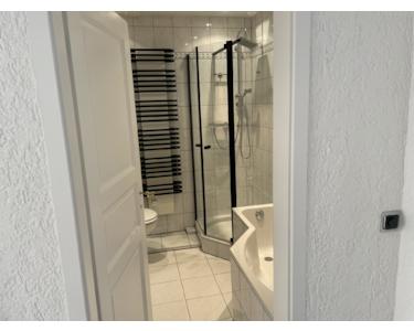 Das gepflegte Dusch- und Wannenbad mit Waschbecken, Tiefspül-Wand-WC, Badewanne, Dusche mit Regenwaldduscharmatur sowie Handtuchheizkörper besitzt ein weiß/schwarzes Design.