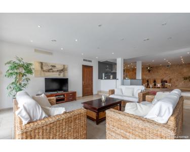 Im oberen Bereich der Finca erwartet Sie ein lichtdurchfluteter Wohnraum mit beeindruckender Aussicht und direktem Zugang zur überdachten Terrasse, die sich perfekt für lange Sommerabende eignet. Ein angrenzender Essbereich sowie eine voll ausgestattete Einbauküche schaffen ein offenes Raumgefühl mit mediterraner Eleganz. Auf dieser Etage befindet sich zudem ein geräumiges Master-Schlafzimmer mit eigenem Badezimmer en suite. Die untere Ebene beherbergt drei weitere Schlafzimmer, zwei Badezimmer sowie einen zusätzlichen Wohnbereich mit Essplatz und offener Küche – von hier aus gelangen Sie direkt zur großzügigen Poolterrasse, die zum Entspannen und Genießen einlädt.