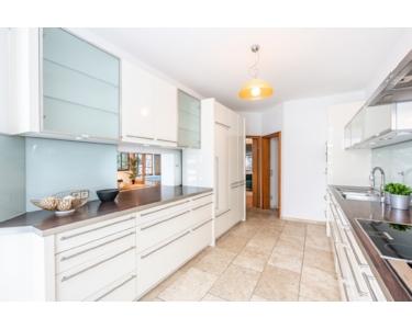 Der Wohnbereich besticht durch hohe Decken und eine offene Galerie, die dem Raum ein beeindruckendes Gefühl von Weite verleihen. Ein gemauerter Kamin sorgt für behagliche Atmosphäre und rundet das luxuriöse Ambiente ab. Die Designer-Einbauküche mit Durchreiche zum Wohnzimmer ist nicht nur ein kulinarisches Highlight, sondern auch ein geselliger Treffpunkt für die ganze Familie.