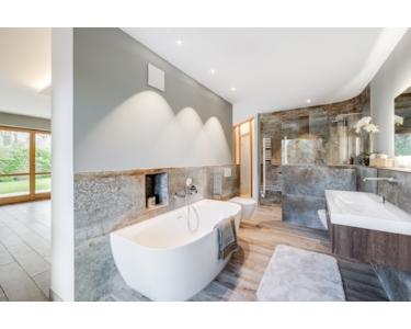- Badezimmer mit frei stehender Badewanne und Regendusche