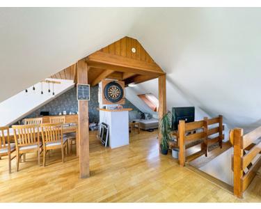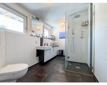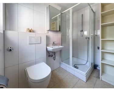 Wohneinheit 4 im Obergeschoss, Dachgeschoss und Kellergeschoss (74 m²): Wohn- und Esszimmer mit offener Küche, Schlafzimmer mit Ankleide und Bad I (mit Wanne, Waschtisch und WC), Bad II (mit Dusche, Waschtisch und WC), Gäste-Bad (mit WC, Dusche und Waschtisch), Hobbyraum