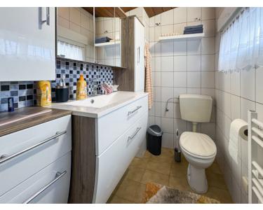 Wohneinheit 2 im Obergeschoss und Dachgeschoss (ca. 86 m²): Wohn- und Esszimmer, Schlafzimmer, Kinderzimmer, Küche (mit Essbereich), Diele, Bad (mit Dusche, Wanne, Waschtisch und WC)