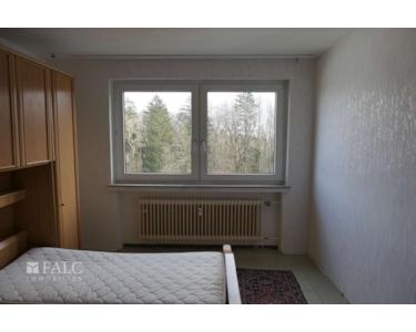 Das Wohnzimmer ist großzügig geschnitten und profitiert von großen Fenstern, die viel Tageslicht hereinlassen. Der Zugang zum Balkon erweitert den Raum und bietet einen Blick ins Grüne, ideal für entspannte Stunden im Freien. Wände und Einrichtung der Wohnung eröffnen individuelle Gestaltungsmöglichkeiten für Ihre Einrichtungsideen.
