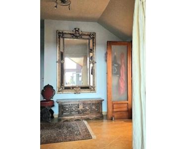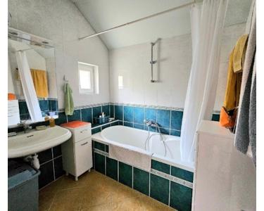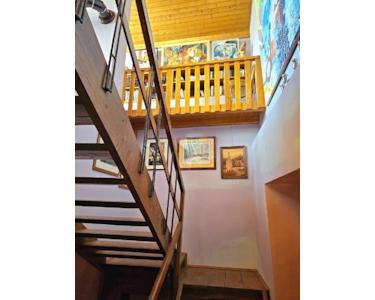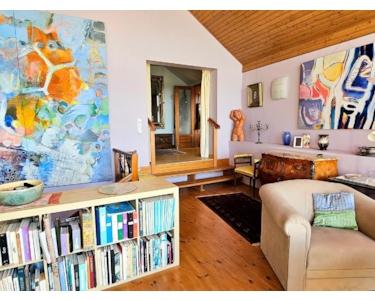 Aufgrund der Grundstückslage ist das Haus terrassenförmig angelegt, sodass beide Etagen Zugang zum Garten haben. Vom Flur im Erdgeschoss gelangt man zu einem Schlafzimmer mit Gartenzugang, das auf Wunsch in zwei Räume umgewandelt werden kann: ein Studio, ein Keller mit Vorratskammer und ein Badezimmer.