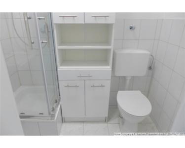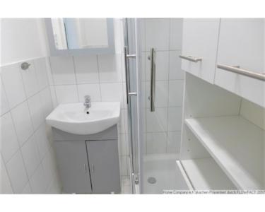 Laminatboden in Diele und Wohnraum, helle Fliesen im Duschbad,