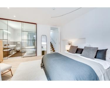 Das zweite Obergeschoss beeindruckt mit einem großzügigen Schlafzimmer im Loftstil, das durch ein en-suite Badezimmer mit Walk-in-Dusche und freistehender Badewanne ergänzt wird. Hohe Decken und eine offene Gestaltung verleihen diesem Bereich ein besonders exklusives Ambiente.