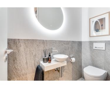 Im Erdgeschoss erwartet Sie eine helle, hochwertig ausgestattete Küche, die nahtlos in den einladenden Wohn- und Essbereich übergeht. Große Fensterfronten sorgen für eine freundliche Atmosphäre, während die angrenzende Frühstücksterrasse einen perfekten Ort für entspannte Morgenstunden bietet. Ein Gäste-WC rundet diese Ebene ab.