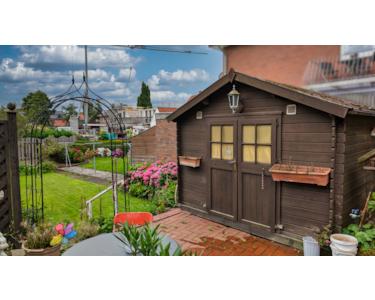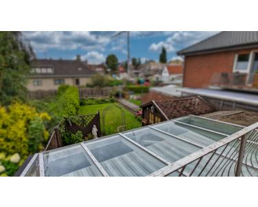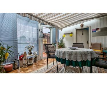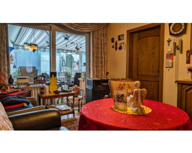Der Essbereich begeistert mit sichtbaren Holzbalken und schafft eine warme, einladende Atmosphäre. Zusätzlichen Komfort bieten der geflieste Wintergarten, ein pflegeleichter Garten mit Terrasse sowie ein separates Gartenhaus – ideal zum Entspannen oder für Hobbyzwecke.