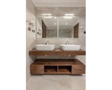 Die gesamte Wohnung ist mit großen Schiebesteinen dekoriert, die Böden sind mit hochwertiger Porzellankeramik belegt und die abgehängten Decken mit integrierter Beleuchtung sorgen für eine entspannte Atmosphäre. Die Eingangstür der Wohnung ist einbruchhemmend, gefertigt vom italienischen Hersteller Diera, ebenso die Zimmertür aus hochwertigem Walnussholz des gleichen Herstellers. Die Badezimmer sind mit hochwertigen Geräten und Sanitärartikeln in einer Kombination aus Holz und Keramik ausgestattet. Die Wohnung verfügt über Fußbodenheizung und -kühlung mit Mitsubishi-Klimaanlagen und Brüstungs-Innengeräten in jedem Raum.