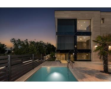 Die Außenfassade besteht aus hinterlüftetem römischem Travertinstein, während die gesamte Villa aus Stahlbeton gebaut ist, was im Falle eines Erdbebens ein Höchstmaß an Sicherheit darstellt.