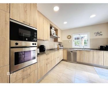 Beide Wohnzimmer führen direkt auf eine großzügige Veranda, die mit dem fantastischen Außenbereich verbunden ist: ein Essbereich mit Grillplatz im Freien, eine gemütliche Relax-Ecke und eine Treppe, die auf die Dachterrasse führt – von dort aus genießt man einen beeindruckenden Blick auf den gesamten Garten, während Familie und Freunde alle vorhandenen Freizeitmöglichkeiten nutzen.